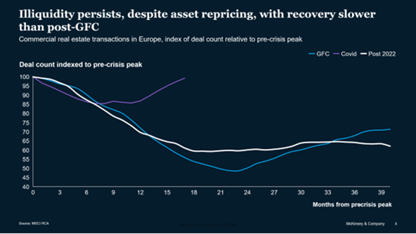Liquidity remains below historic norms. The downturn has been shallower than the post-global financial crisis correction, but the recovery has also been slower. This means that while the industry hasn’t found itself in widespread distress, it hasn’t been particularly liquid either for several years.